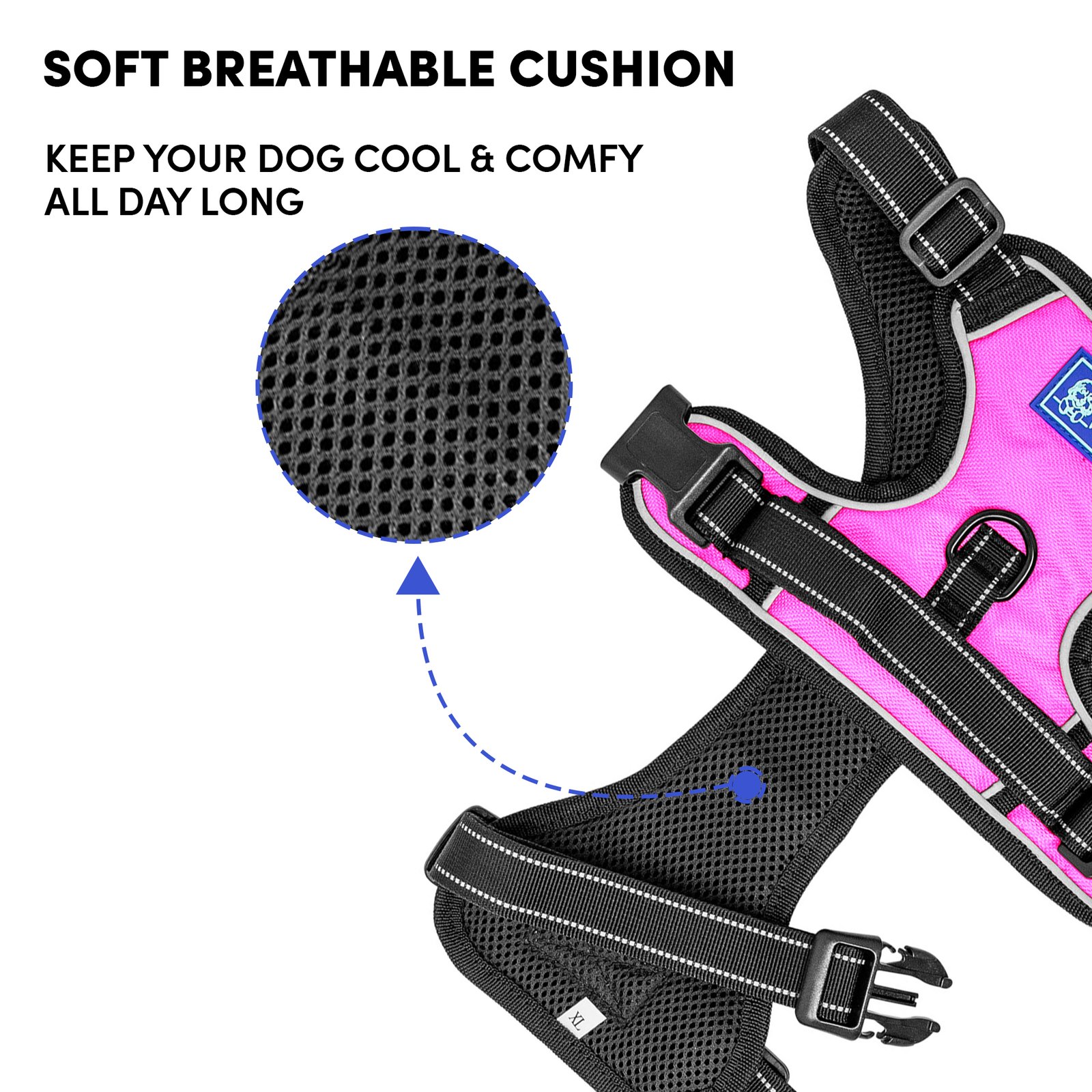 Barkbutler x Whoof Whoof Double Padded Harness provides dual support from the top and the bottom. It also has no choke design, spreading the pressure evenly throughout the chest rather than solely on the neck. Soft breathable cushioning provides much comfort and coat friendliness for the dog. Reflective threading provides better visibility. Safe locks keep the snap release buckle in place. Metal rings promote durability. Adjustable points ensure a snug and perfect fit.
