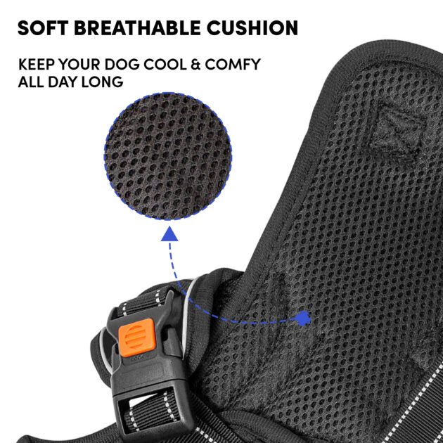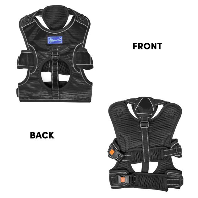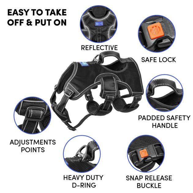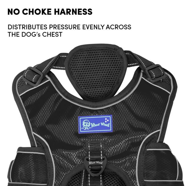 Barkbutler x Whoof Whoof Three Layer Harness provides much needed support and control to doggo on the go. Reflective thread and strips woven for better visibility. Safe locks to prevent jerks. Padded safety handles for strain prevention. Heavy duty D-ring for unleashing prevention. Adjustment point for a snug, perfect fit. No choke harness spreads pressure evenly rather than just the neck area. Soft breathable cushions are coat friendly and provide much needed comfort. Escape proof dog harness for a fussy, runny doggo. Also has a support harness for senior dogs.
