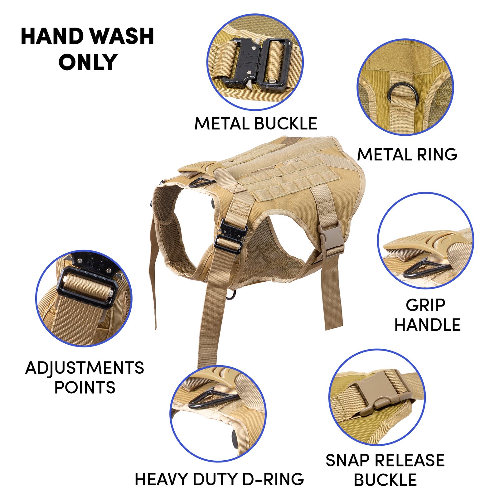 Barkbutler x Whoof Whoof Tactical Harness is a fully padded large dog military harness. It also has no choke design, spreading the pressure evenly throughout the chest rather than solely on the neck. Soft breathable cushioning provides much comfort and coat friendliness for the dog. Reflective threading provides better visibility. Safe locks keep the snap release buckle in place. Heavy duty D- rings promote durability. Adjustable points ensure a snug and perfect fit. Dedicated Hook and Loop Panel for badges. Hand wash is recommended to get tough to reach places.