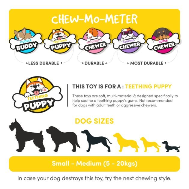 Crafted from ZippyTuff TPR, these chew toys for dogs are soft enough to soothe sore gums but tough enough for endless rounds of chewing and chomping. The durable rope attachment of these chew toys for puppies add extra tugging power and a different texture to explore, keeping your pup stimulated and satisfied.