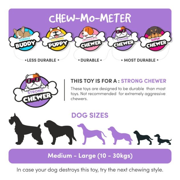 Recommended for small to large dogs (10–30 kgs), including Beagles, Indies, Labradors, and Huskies. Not for extreme power chewers, but perfect for pups who chew hard and play harder.